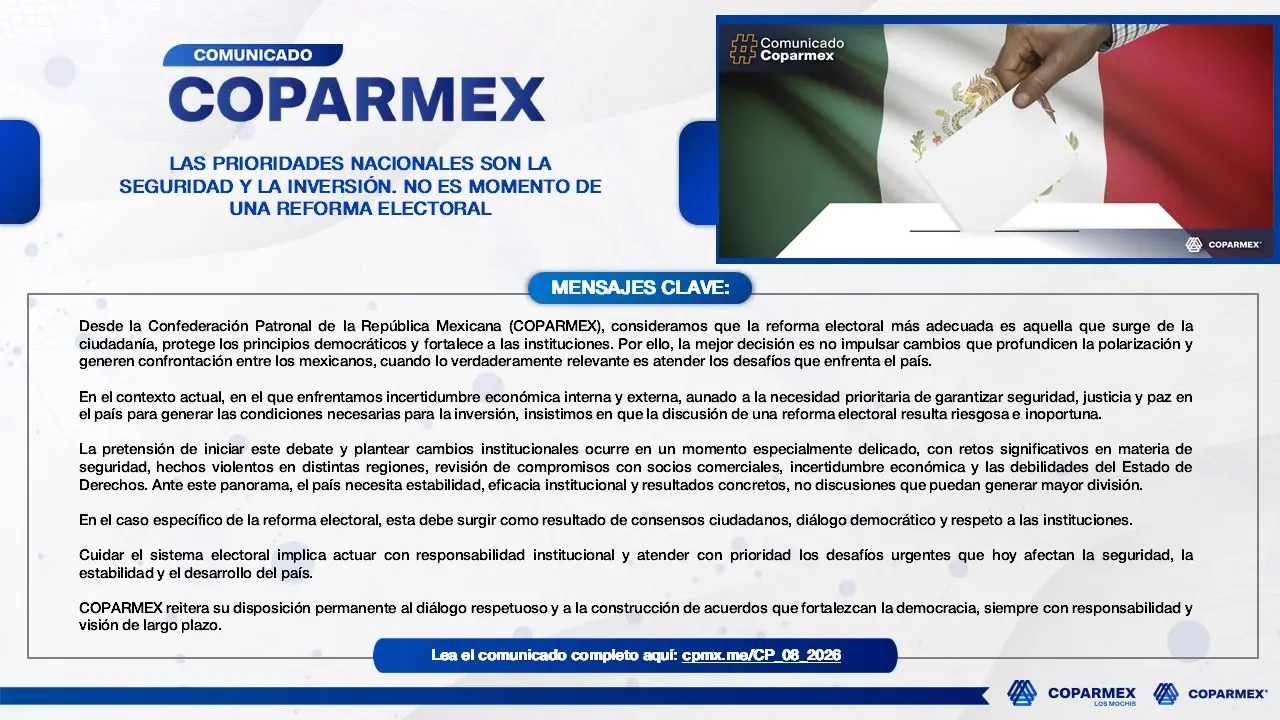 En medio del debate nacional por la iniciativa de reforma electoral presentada por el Gobierno Federal, la Confederación Patronal de la República Mexicana (COPARMEX) fijó postura: no es momento de modificar las reglas electorales del país.