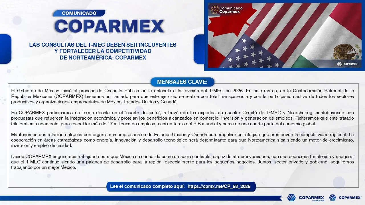 - La Oficina del Representante Comercial de los Estados Unidos (USTR, por sus siglas en inglés) abrió oficialmente un proceso de consulta pública rumbo a la revisión conjunta del T-MEC, programada para el 1 de julio de 2026. De manera paralela, el gobierno de México inició sus propias consultas el miércoles 17 de septiembre. Ante el inicio de este periodo de evaluación por parte de los tres países, el secretario de Economía, Marcelo Ebrard Casaubón, celebró la noticia al considerar que marca un avance fundamental. Ebrard detalló que, en el proceso de revisión, México pondrá énfasis en tres temas principales: los aranceles sobre acero, aluminio y automóviles; la cuota compensatoria al tomate, y el cumplimiento del fallo relativo a las reglas de origen en el sector automotriz.