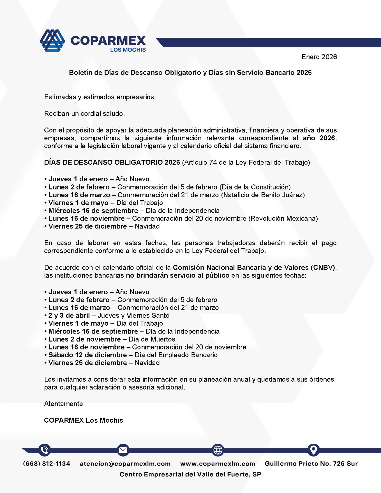 Con el propósito de apoyar la adecuada planeación administrativa, financiera y operativa de sus empresas, compartimos días de descanso obligatorio para el año 2026.